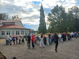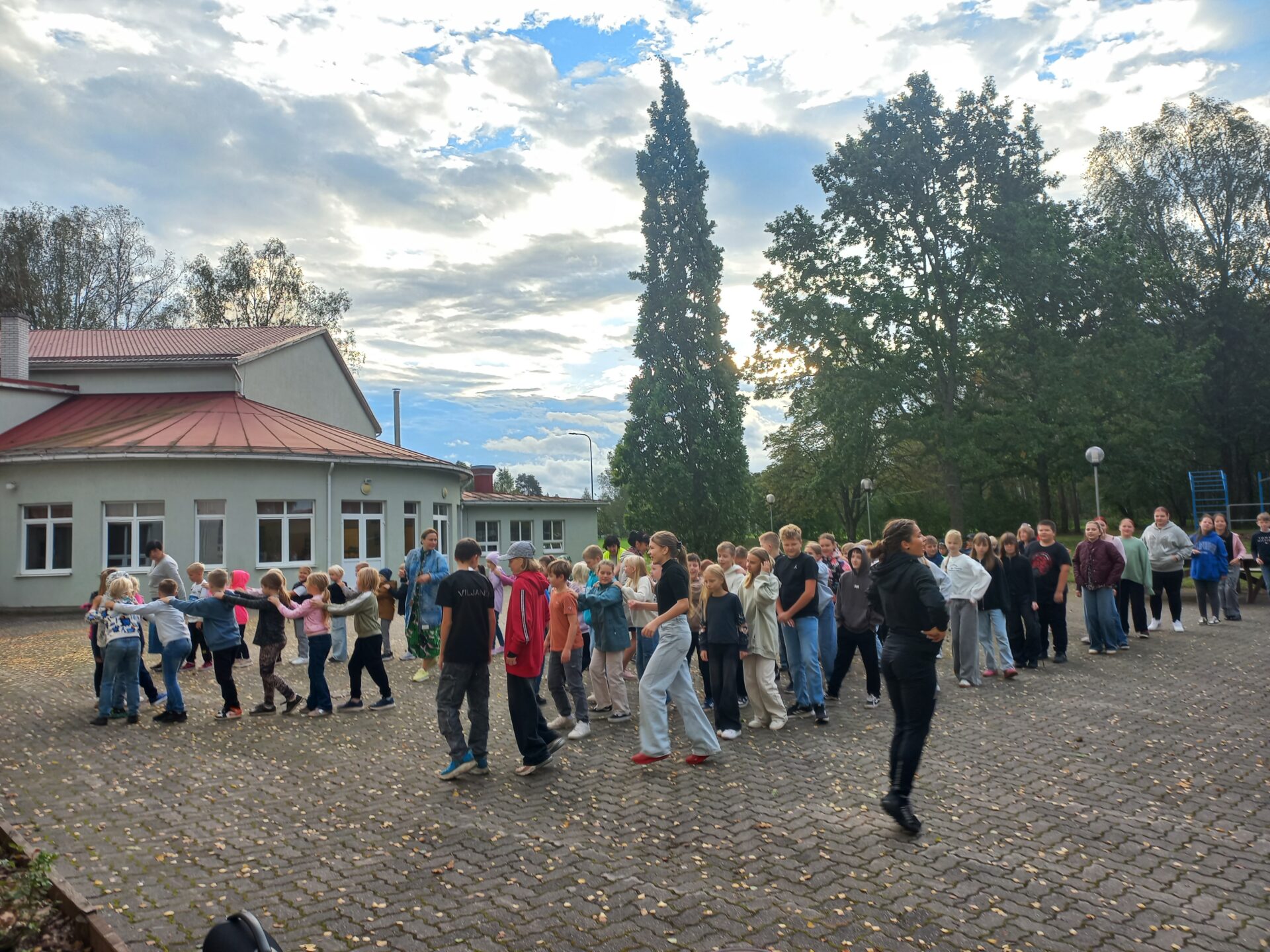 „Hommik käima!“ Ühine hommikuvõimlemine Anettega koolimaja õuel kell 8.00. Õpetaja Aivaga lauldi võro keelset sünnipäevalaulu peatselt algavale sügisele.